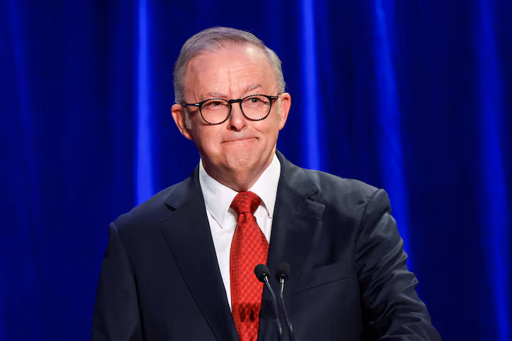অস্ট্রেলিয়ার প্রধানমন্ত্রী অ্যান্থনি আলবানিজ ৩ মে, ২০২৫ তারিখে অস্ট্রেলিয়ার সিডনিতে অস্ট্রেলিয়ার ফেডারেল নির্বাচনের দিন স্থানীয় মিডিয়া লেবার পার্টির বিজয়ের কথা প্রচার করার পর লেবার পার্টির নির্বাচনী রাতের অনুষ্ঠানে বক্তব্য রাখার সময় প্রতিক্রিয়া জানাচ্ছেন। রয়টার্স