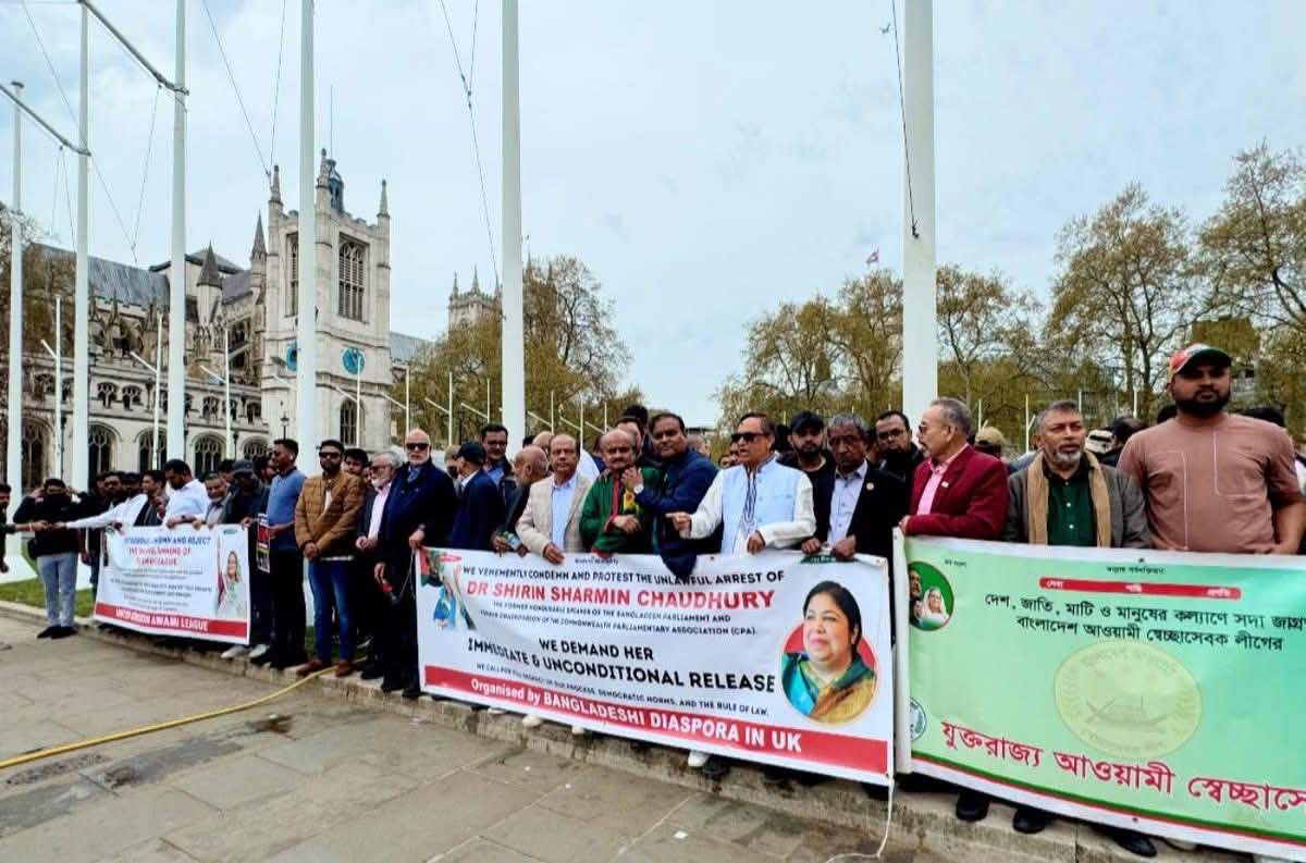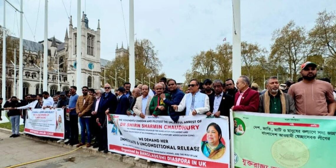 আওয়ামীলীগ নিষিদ্ধ ও স্পীকার শিরিন শারমিন চৌধুরীর গ্রেফতারের প্রতিবাদে ব্রিটিশ পার্লামেন্টের সামনে যুক্তরাজ্য আওয়ামীলীগের প্রতিবাদ বিক্ষোভ