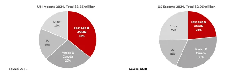 মার্কিন যুক্তরাষ্ট্র অর্থনৈতিকভাবে এশিয়ার উপর বিশেষভাবে নির্ভরশীল নয় (আমদানি ৩৬% এবং রপ্তানি ২৪%) এবং সাংস্কৃতিকভাবে ন্যূনতমভাবে সংহত।