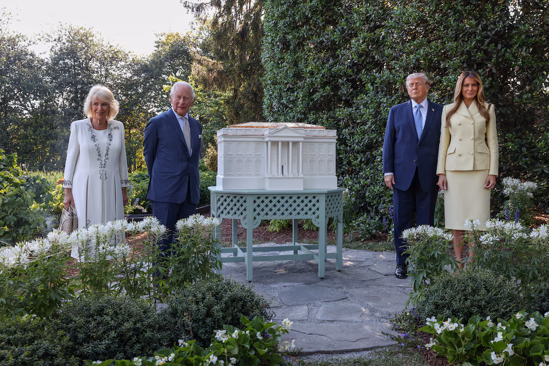 সংক্ষিপ্ত আগমনী অনুষ্ঠানের পর জয়েন্ট বেস অ্যান্ড্রুজে অবতরণ করে চার্লস ও ক্যামিলা হোয়াইট হাউসে যান, যেখানে ট্রাম্প ও ফার্স্ট লেডি মেলানিয়া ট্রাম্প তাঁদের স্বাগত জানান। মেলানিয়া ট্রাম্প রাজা ও রানীর গালে চুম্বন বিনিময় করেন এবং প্রেসিডেন্ট তাঁদের সঙ্গে করমর্দন করেন। চারজনই আলোকচিত্রীদের জন্য কিছুক্ষণ দাঁড়ানোর পর একটি ব্যক্তিগত চা-চক্রের জন্য ভেতরে চলে যান।