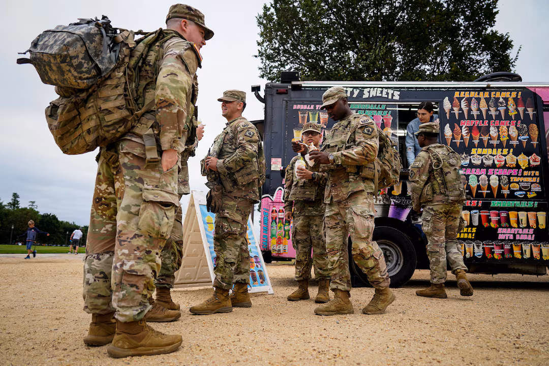 বৃহস্পতিবার ওয়াশিংটনের ন্যাশনাল মলে, যা আমেরিকার রাজধানীর অন্যতম নিরাপদ স্থান, সেখানে সামরিক পোশাক এবং যুদ্ধের বুট পরিহিত শত শত ন্যাশনাল গার্ড সৈন্য পর্যটকদের সাথে মিশে গেল, সেলফি তুলল এবং খাবারের ট্রাক থেকে আইসক্রিম খেয়ে নিজেদের আনন্দ দিল।