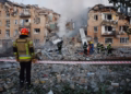 ২৮শে আগস্ট, ২০২৫ তারিখে ইউক্রেনের কিয়েভে রাশিয়ার ক্ষেপণাস্ত্র ও ড্রোন হামলার মুখে পড়া একটি অ্যাপার্টমেন্ট ভবনের স্থানে উদ্ধারকারীরা কাজ করছেন। রয়টার্স