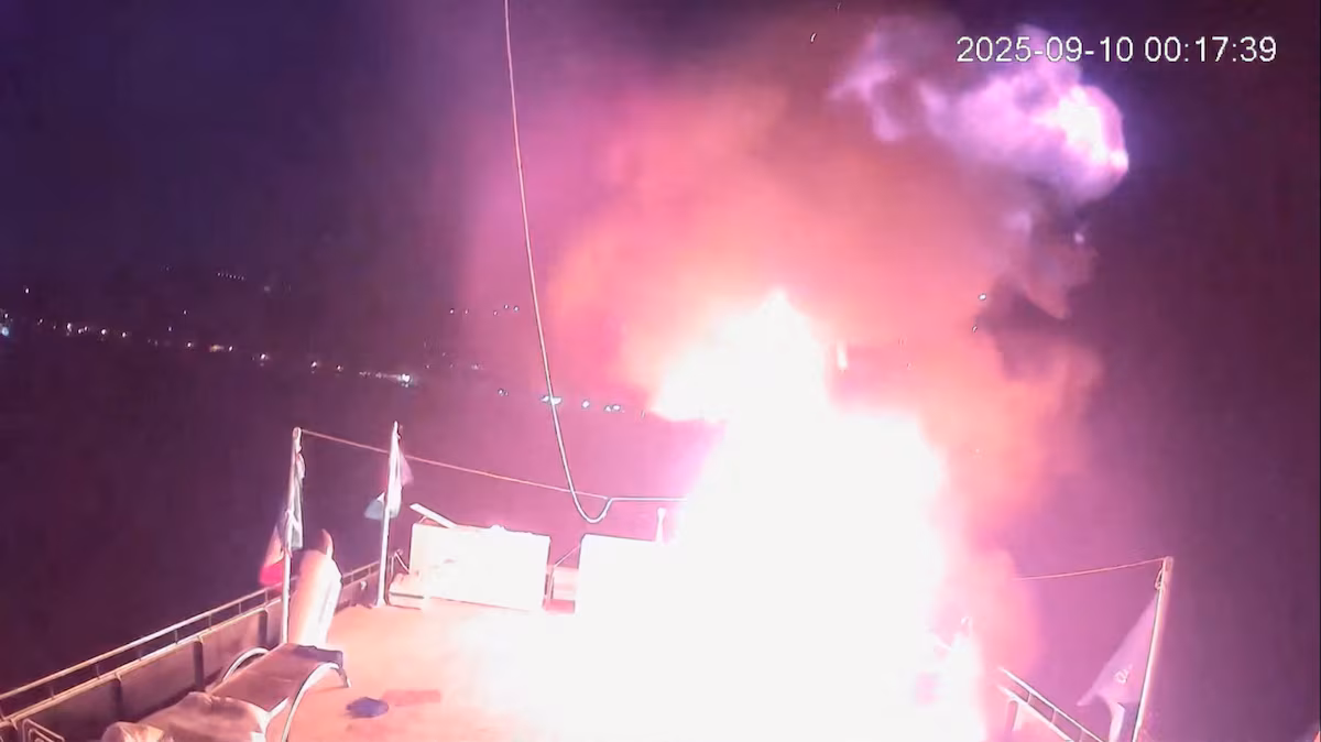 একটি সিসিটিভি ফুটেজে ৯ সেপ্টেম্বর, ২০২৫ তারিখে তিউনিসিয়ার উপকূলে তিউনিসিয়ার জলসীমায় গ্লোবাল সুমুদ ফ্লোটিলা (জিএসএফ) এর একটি জাহাজ আলমাতে আগুন লাগার ঘটনা দেখা যাচ্ছে। একটি হ্যান্ডআউট ভিডিও থেকে প্রাপ্ত এই স্ক্রিনশটে। গ্লোবাল সুমুদ ফ্লোটিলা/হ্যান্ডআউট রয়টার্সের মাধ্যমে