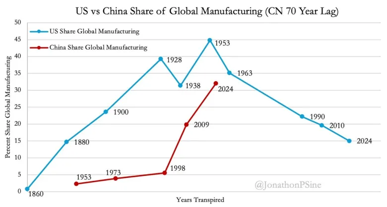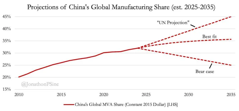 ১. দ্রষ্টব্য: আমি প্রায়শই জাতিসংঘের পূর্বাভাস পোস্ট করি যে ২০৩০ সালের মধ্যে চীন সমস্ত বৈশ্বিক উৎপাদন মূল্যের ৪৫% যোগ করবে। কিন্তু জোনাথন পি সাইন উল্লেখ করেছেন যে ৩৬% আরও বাস্তবসম্মত অনুমান হবে: