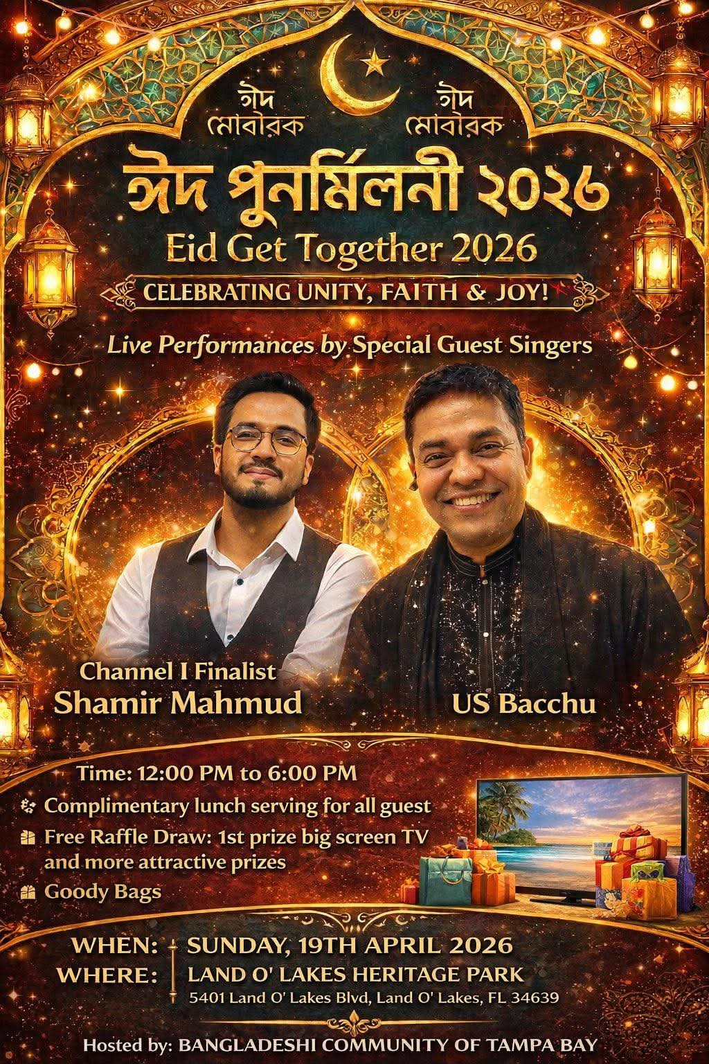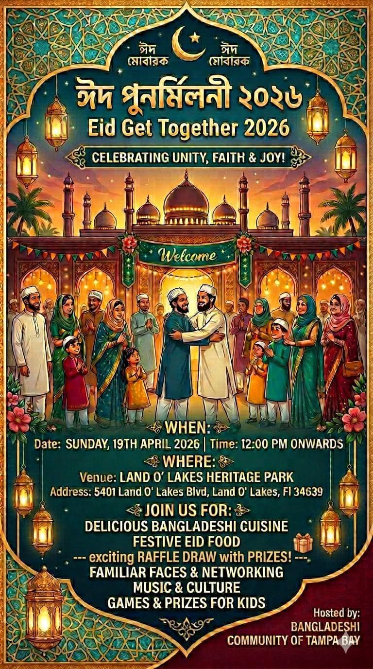বাংলাদেশি কমিউনিটি অফ টেম্পা বে এর আয়োজনে ল্যান্ড ও লেকস হেরিটাজ পার্কে অনুষ্ঠিত হবে ঈদ-পুনর্মিলনী।