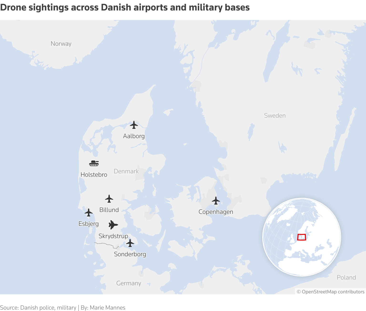 গুরুত্বপূর্ণ অবকাঠামোর দুর্বলতা নিয়ে উদ্বেগ বৃদ্ধির সাথে সাথে, ডেনমার্কের মানচিত্রে আলবর্গ, কোপেনহেগেন, এসবজার্গ, সন্ডারবর্গ, স্ক্রিডস্ট্রুপ, বিলুন্ড এবং হোলস্টেব্রোতে বিমানবন্দর এবং সামরিক ঘাঁটির কাছে ড্রোনগুলি কোথায় দেখা গেছে তা দেখানো হয়েছে।