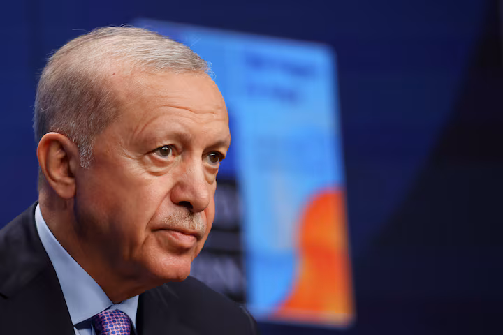 ২৫ জুন, ২০২৫ তারিখে নেদারল্যান্ডসের হেগে ন্যাটো শীর্ষ সম্মেলনে এক সংবাদ সম্মেলনে তুরস্কের রাষ্ট্রপতি তাইয়্যেব এরদোগানের নজর। রয়টার্স