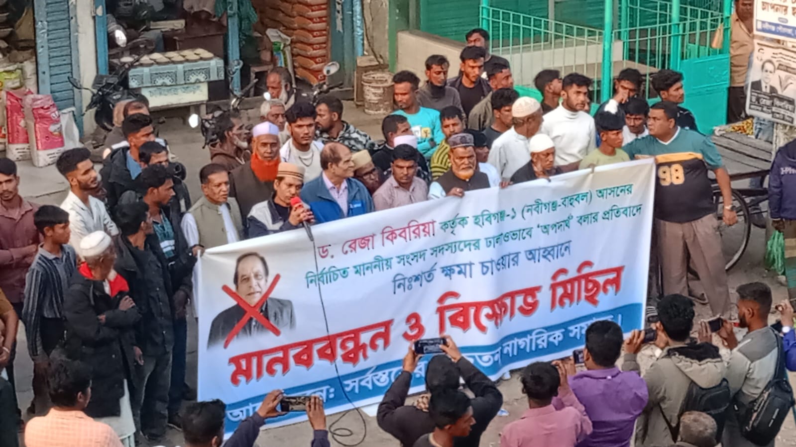 হবিগঞ্জ-১ (নবীগঞ্জ–বাহুবল) আসনে বিএনপির মনোনীত প্রার্থী বহুল আলোচিত সমালোচিত ড. রেজা কিবরিয়া কর্তৃক ওই আসনের সাবেক সকল সংসদ সদস্যকে ঢালাওভাবে ‘অপদার্থ’ বলে আখ্যায়িত করার প্রতিবাদে এবং এ ধরনের বক্তব্যের জন্য নিঃশর্ত ক্ষমা চাওয়ার দাবিতে নবীগঞ্জে বিশাল মানববন্ধন অনুষ্ঠিত হয়েছে।