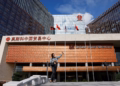 মস্কোর উত্তর-পূর্বে একটি চীনা ব্যবসায়িক কেন্দ্রে চীনা পতাকা উড়ছে এবং লোকেরা অলঙ্কৃত চীনা প্যাভিলিয়নের নীচে কাছাকাছি ল্যান্ডস্কেপ পার্কের মধ্য দিয়ে হেঁটে যাচ্ছে।