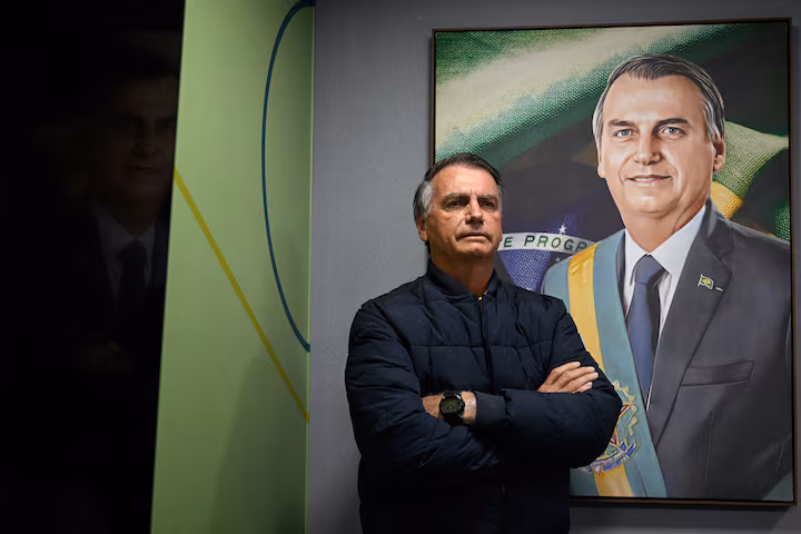 ১৮ জুলাই, ২০২৫, ব্রাজিলের ব্রাসিলিয়ায় রয়টার্সের সাথে একটি সাক্ষাৎকারের পর ব্রাজিলের প্রাক্তন রাষ্ট্রপতি জাইর বলসোনারো ছবির জন্য পোজ দিচ্ছেন। রয়টার্স