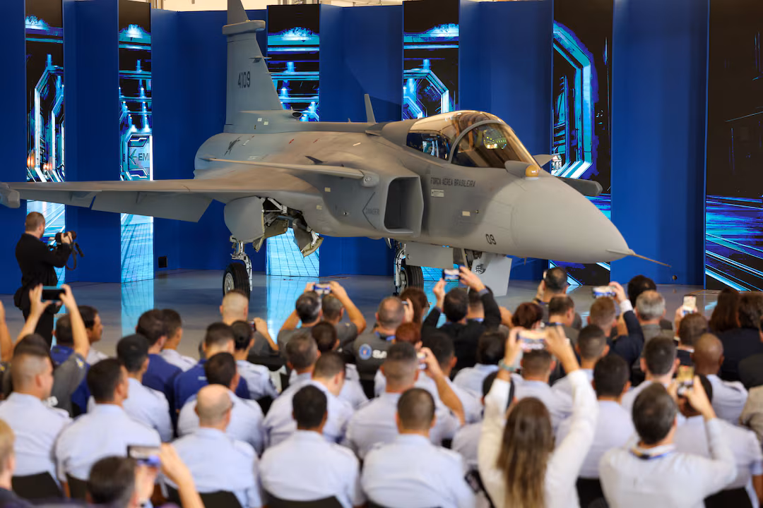 ২৫ মার্চ, ২০২৬ তারিখে ব্রাজিলের সাও পাওলো রাজ্যের গাভিয়াও পেইশোটো কারখানায় এমব্রায়ার এবং সুইডিশ প্রতিরক্ষা সংস্থা সাব-এর আয়োজিত ব্রাজিলে নির্মিত প্রথম গ্রিপেন যুদ্ধবিমানের উপস্থাপনা অনুষ্ঠানে লোকজন উপস্থিত হন। রয়টার্স