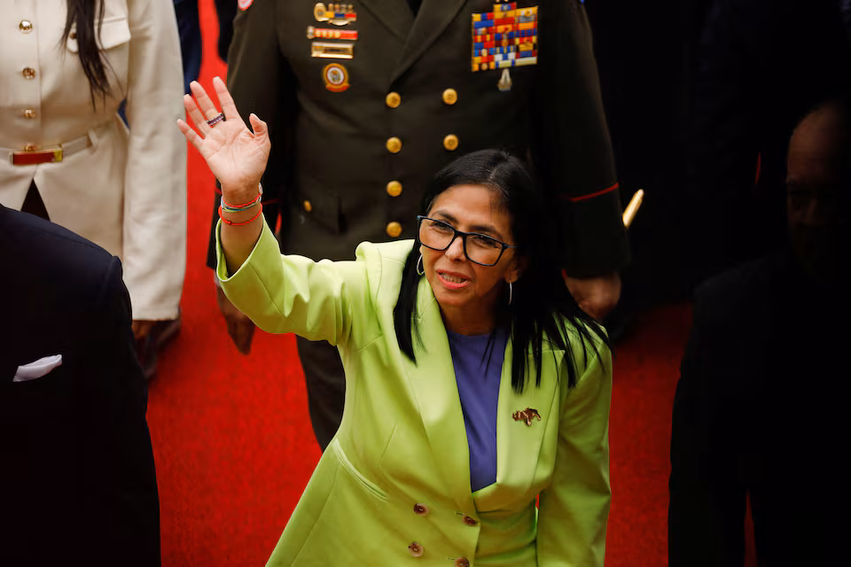 ১৫ জানুয়ারী, ২০২৬ তারিখে ভেনেজুয়েলার কারাকাসে মার্কিন হামলার ফলে প্রেসিডেন্ট নিকোলাস মাদুরো এবং তার স্ত্রী সিলিয়া ফ্লোরেসকে আটক করার পর, ভেনেজুয়েলার অন্তর্বর্তীকালীন রাষ্ট্রপতি ডেলসি রদ্রিগেজ জাতীয় পরিষদে জাতির উদ্দেশ্যে তার প্রথম বার্ষিক ভাষণ দিতে হাঁটতে হাঁটতে হাত নাড়ছেন। রয়টার্স