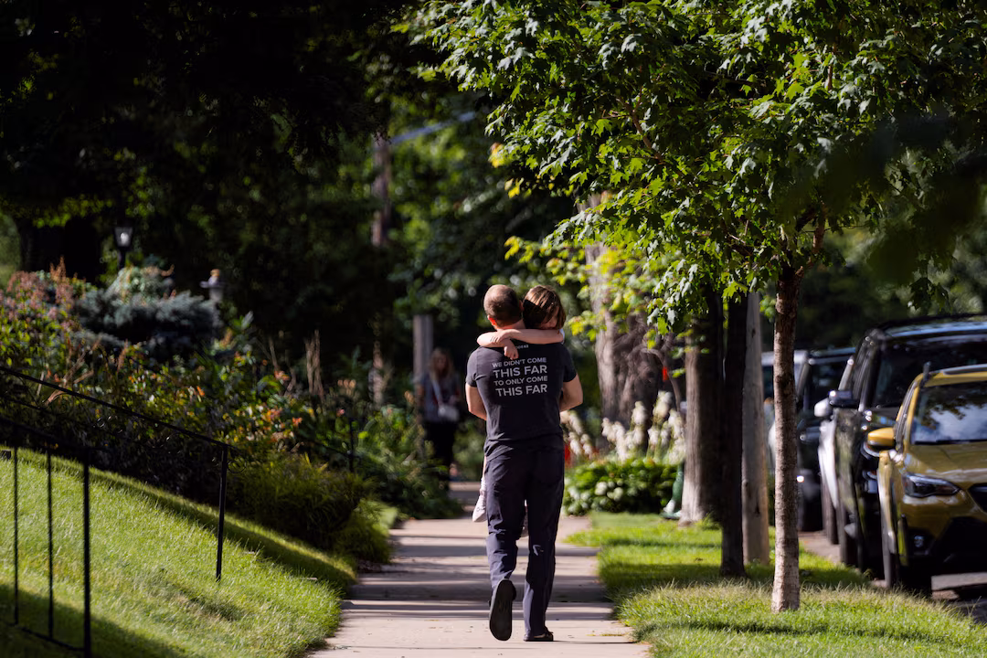 8. ২৭শে আগস্ট, ২০২৫ তারিখে মার্কিন যুক্তরাষ্ট্রের মিনেসোটার মিনিয়াপোলিসে অ্যানানসিয়েশন চার্চে গুলিবর্ষণের পর একজন বাবা তার মেয়েকে বহন করে তাদের গাড়ির দিকে হেঁটে যাচ্ছেন। এই চার্চটি একটি প্রাথমিক বিদ্যালয়ের আবাসস্থল। রয়টার্স