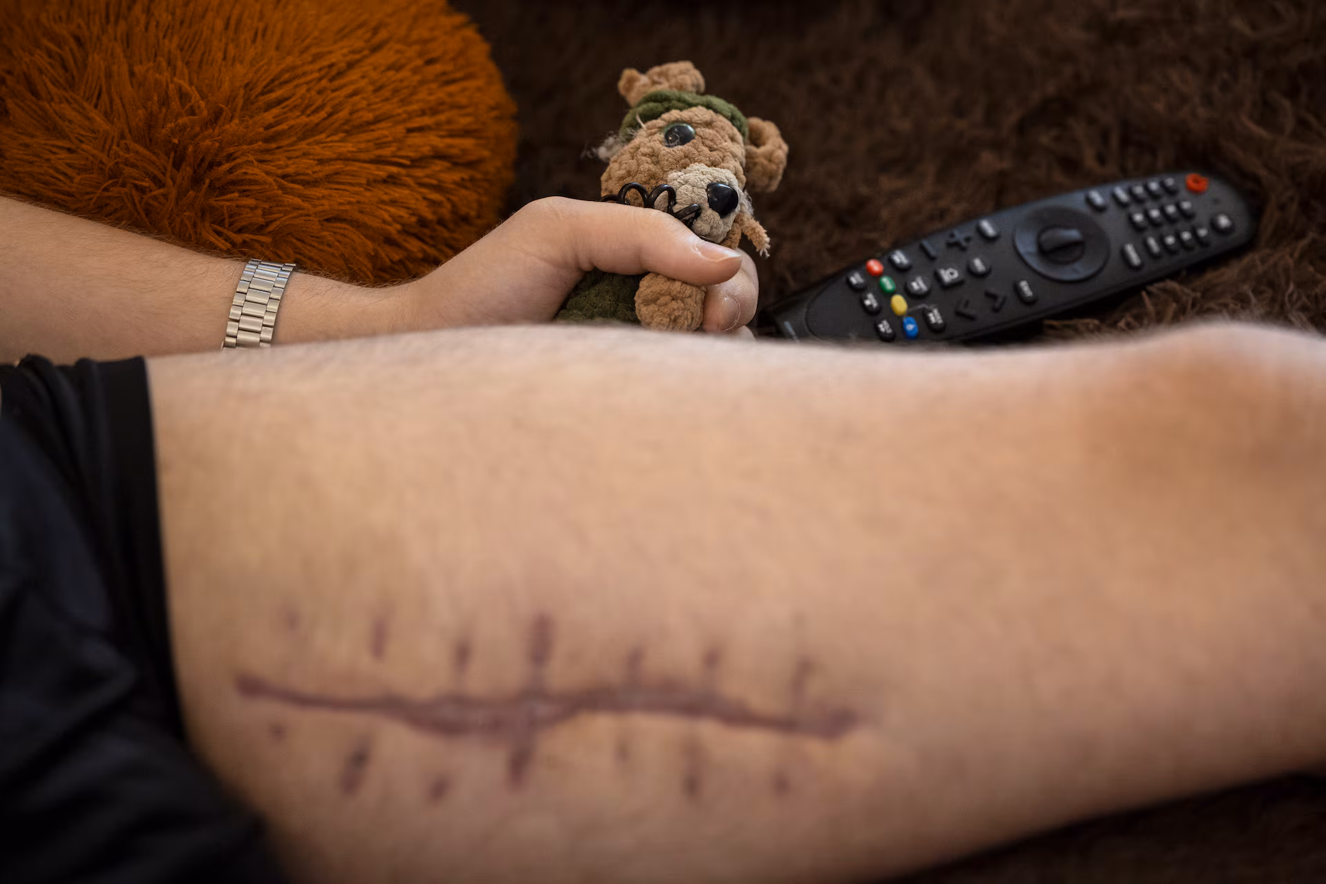 যুদ্ধক্ষেত্রে উভয় পায়ে গুলিবিদ্ধ ব্রোশকভ দক্ষিণ ইউক্রেনের বন্দর নগরী ওডেসার তার অ্যাপার্টমেন্টে তার ক্ষত থেকে সেরে উঠছেন। রয়টার্স/থমাস পিটার