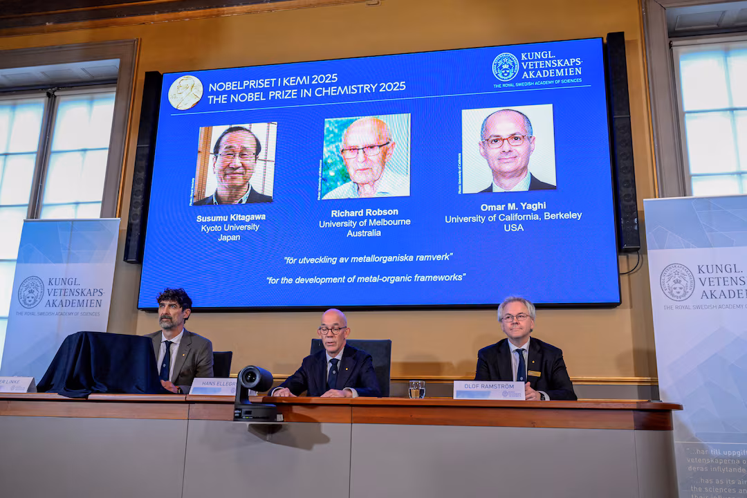 বিজ্ঞানী সুসুমু কিতাগাওয়া, রিচার্ড রবসন এবং ওমর ইয়াঘি ২০২৫ সালে রসায়ন বিজ্ঞানে নোবেল পুরস্কার জিতেছেন, নতুন ধরণের আণবিক স্থাপত্য তৈরির জন্য, যা জলবায়ু পরিবর্তন এবং মিষ্টি জলের অভাবের মতো চ্যালেঞ্জ মোকাবেলায় সাহায্য করতে পারে এমন উপকরণ তৈরি করেছে।