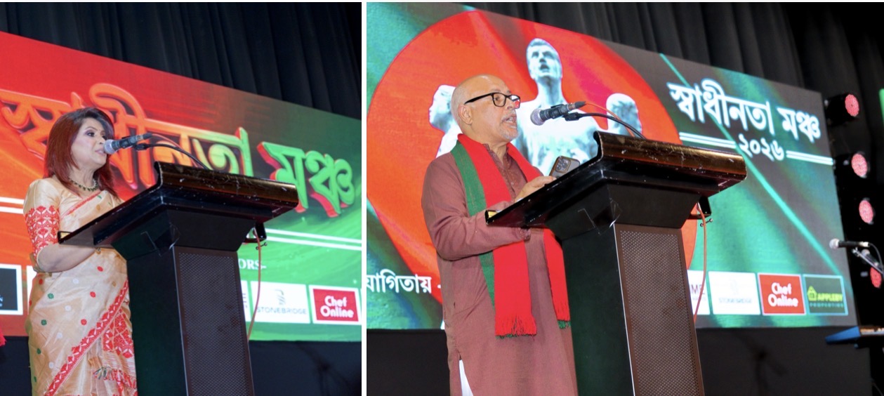 স্বাধীনতা মঞ্চের দুই সংগঠকের আন্তরিক প্রচেষ্টায় আয়োজিত এই অনুষ্ঠান প্রাণবন্ত উপস্থাপনা করেন সংগঠক ও খ্যাতিমান সাংস্কৃতিক ব্যক্তিত্ব ঊর্মি মাজহার। তাঁর সাবলীল বাচনভঙ্গি, উষ্ণ উপস্থিতি এবং আবেগঘন উপস্থাপনায় পুরো অনুষ্ঠান হয়ে ওঠে আরও প্রাণবন্ত ও আকর্ষণীয়। অনুষ্ঠানের শুরুতে স্বাগত বক্তব্য রাখেন আরেক সংগঠক সিনিয়র সাংবাদিক এবং সাপ্তাহিক সত্যবাণী সম্পাদক সৈয়দ আনাস পাশা। তার বক্তব্যে তিনি বলেন, আজ আমরা শুধু একটি দিন উদযাপন করতে এখানে সমবেত হইনি, আমরা এসেছি আমাদের আত্মপরিচয়কে স্মরণ করতে, আমাদের ইতিহাসকে নতুন করে উচ্চারণ করতে। কারণ এই স্বাধীনতা হঠাৎ করে আসেনি; এটি অর্জিত হয়েছে অগণিত শহীদের রক্তে, মা-বোনের ত্যাগে, আর এক মহান নেতা বঙবন্ধুর অবিচল সাহসী নেতৃত্বে। কিন্তু দুঃখজনকভাবে, আজও কিছু অপশক্তি, কিছু বিভ্রান্ত চেতনা আমাদের সেই গৌরবময় ইতিহাসকে মুছে দিতে চায়। তারা আঘাত হানতে চায় আমাদের মুক্তিযুদ্ধের চেতনায়, ধ্বংস করতে চায় আমাদের স্মৃতির ভিত্তি। কিন্তু আমরা দৃঢ়ভাবে বিশ্বাস করি, যে ইতিহাস রক্তে লেখা, তা কখনো মুছে ফেলা যায় না; যে সত্য আত্মত্যাগে নির্মিত, তা কখনো পরাজিত হয় না।
