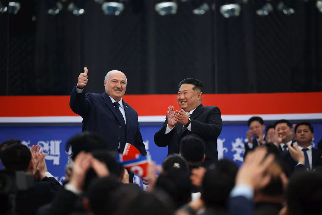উত্তর কোরিয়ার নেতা কিম জং উন এবং বেলারুশের রাষ্ট্রপতি আলেকজান্ডার লুকাশেঙ্কো ২৬ মার্চ, ২০২৬ তারিখে উত্তর কোরিয়ার পিয়ংইয়ংয়ে একটি বৈঠকে অংশগ্রহণ করেন। বেলারুশ প্রজাতন্ত্রের রাষ্ট্রপতি/রয়টার্সের সৌজন্যে প্রাপ্ত ছবি।