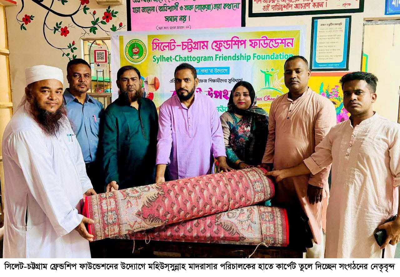 ‘মানুষ মানুষের জন্য’ এ প্রতিপাদ্যে গড়ে ওঠা মানবিক সংগঠন সিলেট-চট্টগ্রাম ফ্রেন্ডশিপ ফাউন্ডেশন যুক্তরাজ্য শাখার উদ্যোগে ও সিলেটের হাজী চাঁন্দ আলী ফাউন্ডেশনের সহযোগিতা ১৮ মার্চ বুধবার, বিকাল ৪টায় নগরীর চট্টগ্রাম রেলওয়ে স্টেশন সংলগ্ন মহিউস্সুন্নাহ মাদরাসা, হেফজখানা ও এতিমখানার কোরআন শিক্ষার্থীদের ব্যবহারের জন্য উন্নতমানের কার্পেট উপহার প্রদান করা হয়।