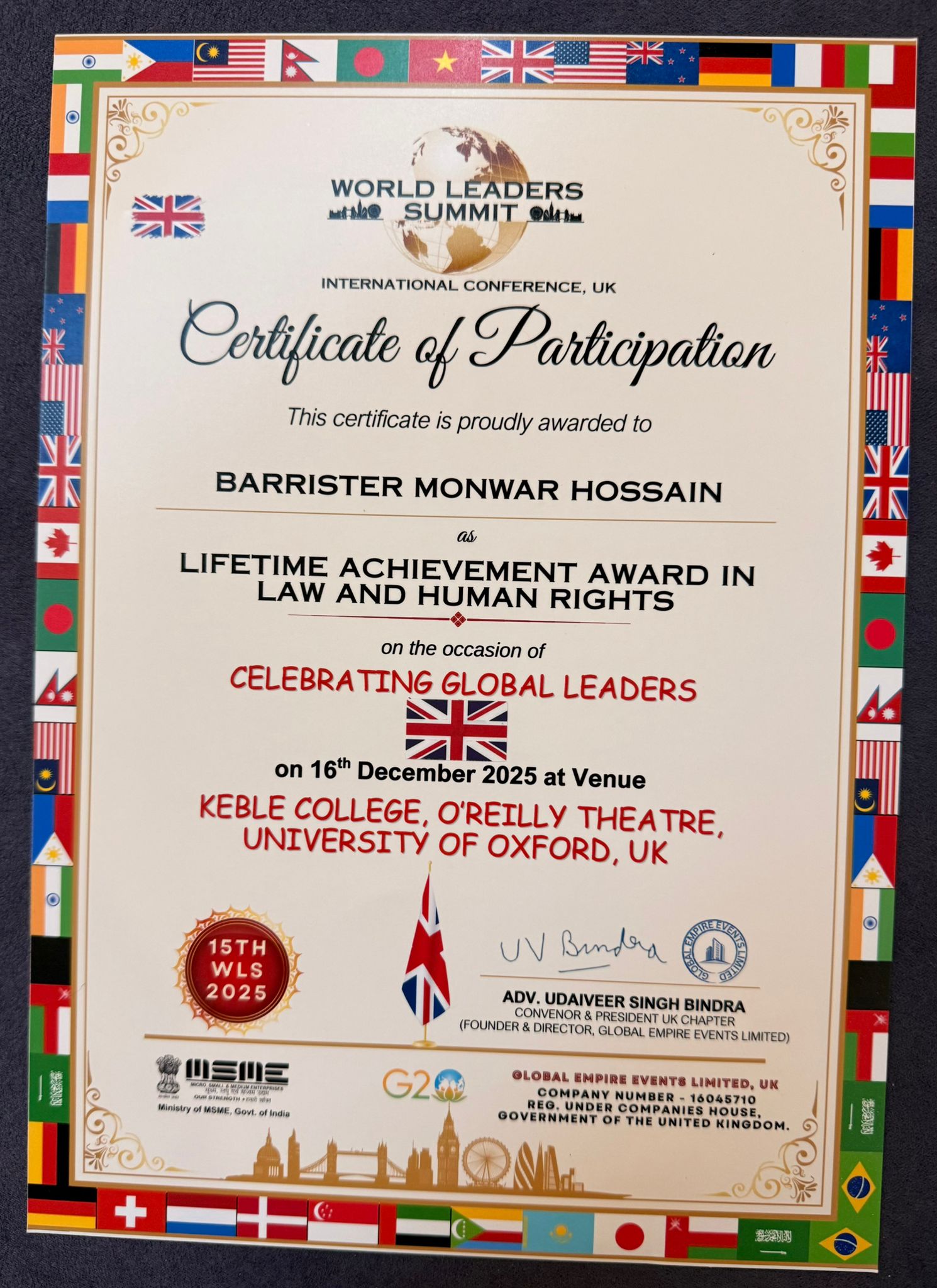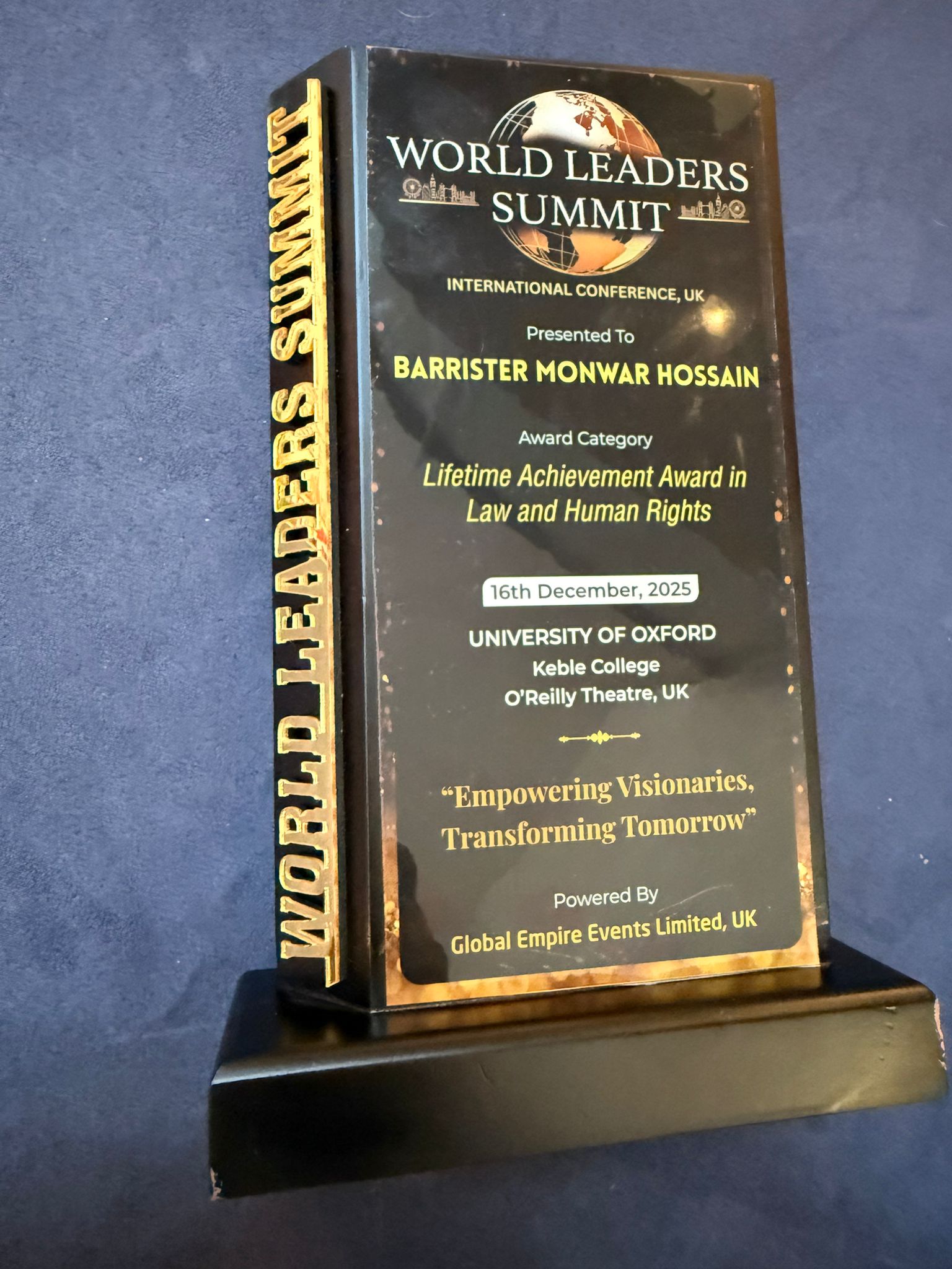 Distinguished British-Bangladeshi lawyer Barrister Monwar Hossain has been awarded the prestigious Lifetime Achievement Award in Law and Human Rights at the 15th World Leaders Summit International Conference held at Keble College, University of Oxford. The award was presented to him at the conference and award ceremony held yesterday.