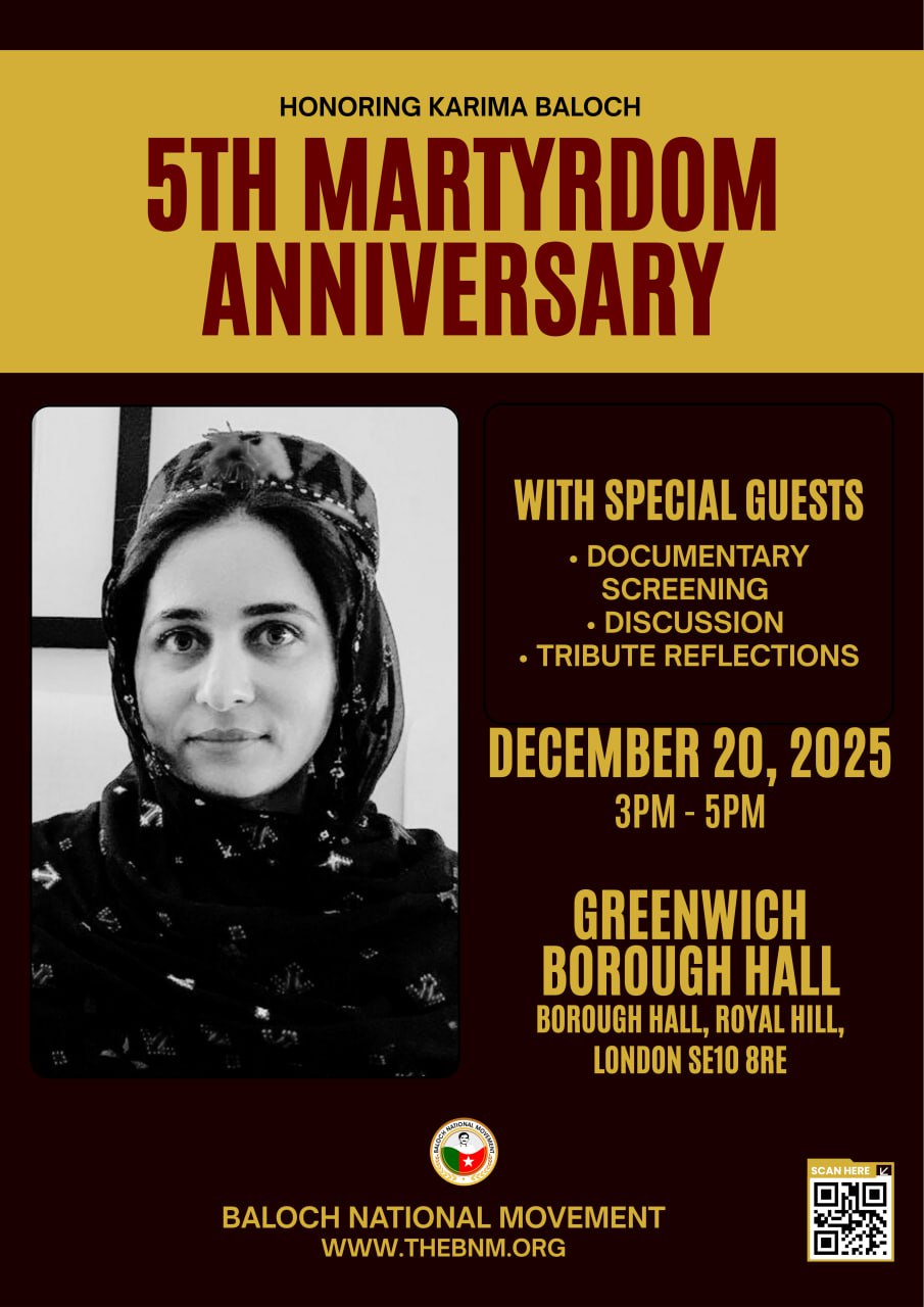 The Baloch National Movement (BNM) organized a seminar in London to mark the fifth anniversary of the martyrdom of Shaheed Banuk Karima Baloch. Political leaders, intellectuals, human rights activists, and representatives of oppressed nations attended the event and expressed solidarity with the Baloch struggle. Participation by people from various nations—particularly Sindhi, Pashtun, Kashmiri, and Gilgit-Baltistan communities—was seen as a symbol of unity among oppressed nations.