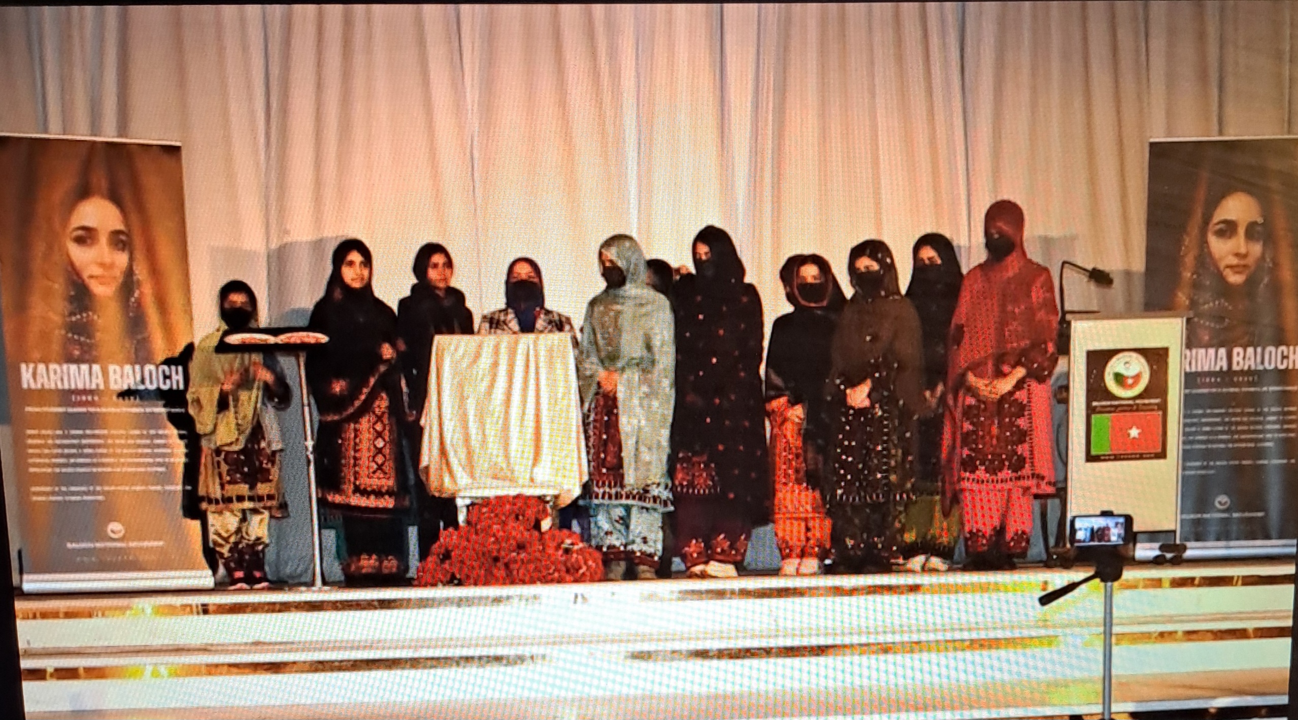 At the beginning of the program, BNM members Mahganj Baloch and Durreen Baloch, who performed the duties of hosts, welcomed the guests. The participants observed a one-minute silence to remember Banuk Karima’s life, struggle, and sacrifice. Following this, Baloch women came onto the stage to pay tribute. Flowers were laid on her portrait created by artist Sanji Baloch, and candles were lit in her memory.