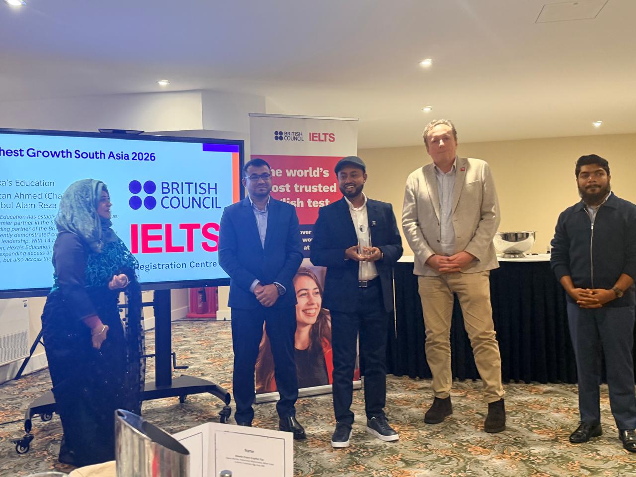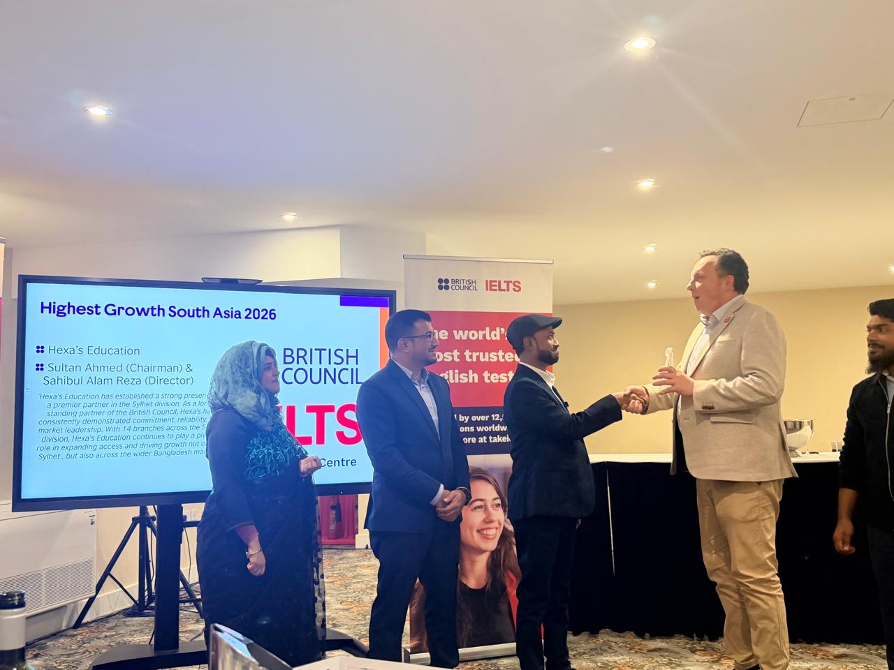 Hexas Education, a leading language learning institution in Sylhet, has earned international recognition beyond national boundaries. Recently, it was honored as a top contributor among institutions worldwide for its outstanding contribution to IELTS. At the same time, Hexas also received the Highest Growth Award in South Asia. These recognitions were awarded by the British Council, the administrator of IELTS.