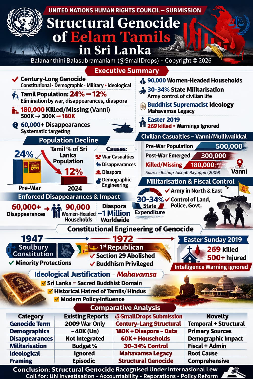 This submission documents the systematic and structural targeting of the Tamil population in Sri Lanka, incorporating constitutional, demographic, militarisation, historical, ideological, and humanitarian evidence. Evidence demonstrates that the Sri Lankan state has conducted long-term demographic engineering, constitutional marginalisation, militarisation of Tamil-majority regions, and systematic violence, amounting to patterns that align with genocide under the 1948 Genocide Convention.